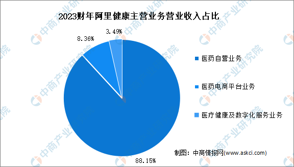 阿里健康的主营业务包括医药自营业务、医药电商平台业务、医疗健康及数字化服务业务,2023财年三大业务营业收入分别实现235.92亿元、22.38亿元、9.33亿元,占比分别为88.15%、8.36%、3.49%。
