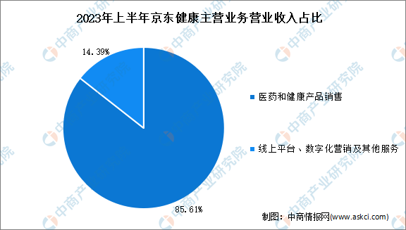 从主营业务来看,2023年上半年,京东健康主营包括医药和健康产品销售,线上平台、数字化营销及其他服务,营业收入分别为232亿元、39亿元,占比分别为85.61%、14.39%。