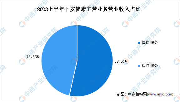 从主营业务来看,2023上半年,平安健康主营业务包括健康服务、医疗服务,营业收入分别为11.89亿元、10.34亿元,分别占主营业务收入的53.51%、46.53%。